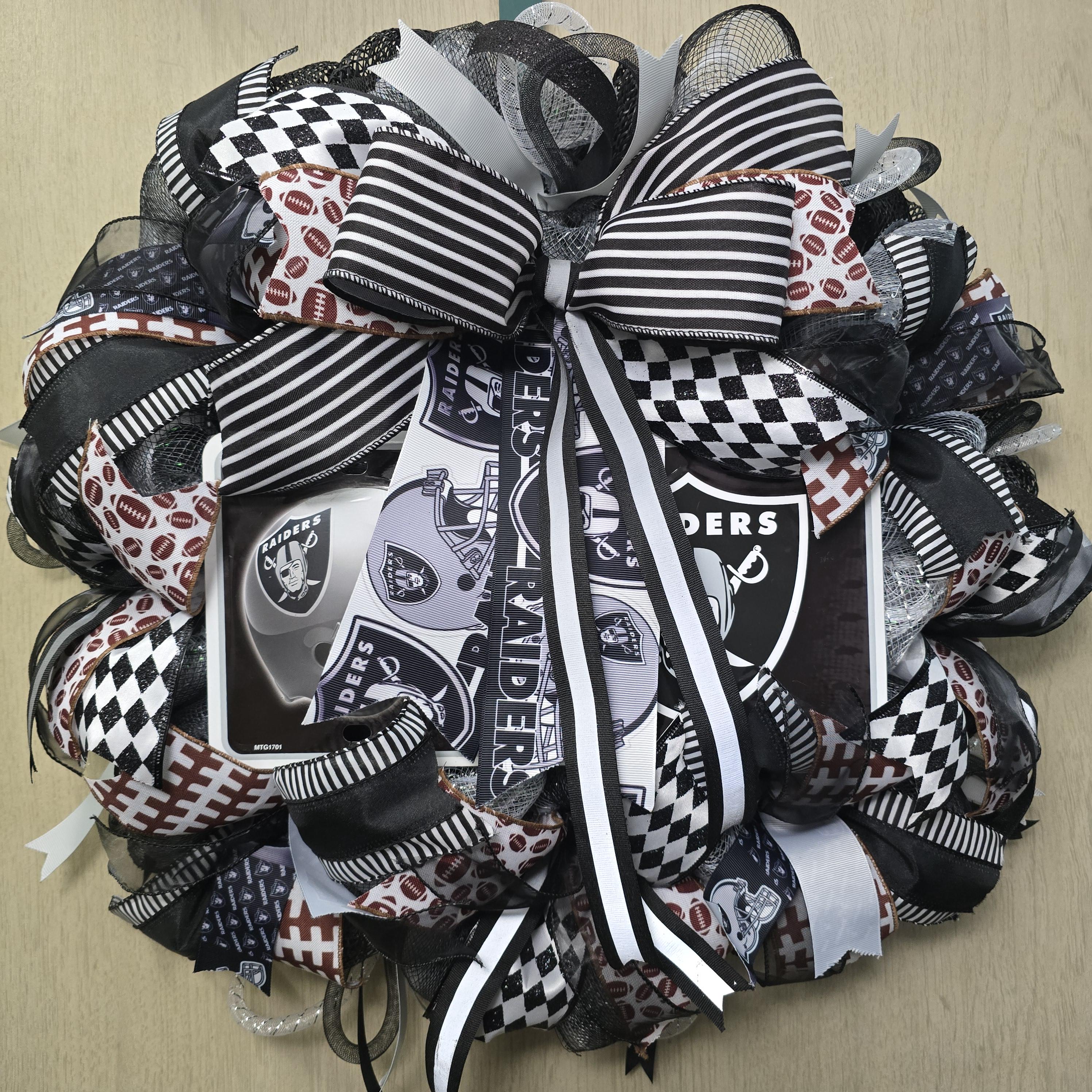 Get into the spirit of game day with this Raiders Wreath! Perfect for any Las Vegas Raiders fan, this 21" wreath is adorned with team colors and logo. Let's Go Raider Nation!