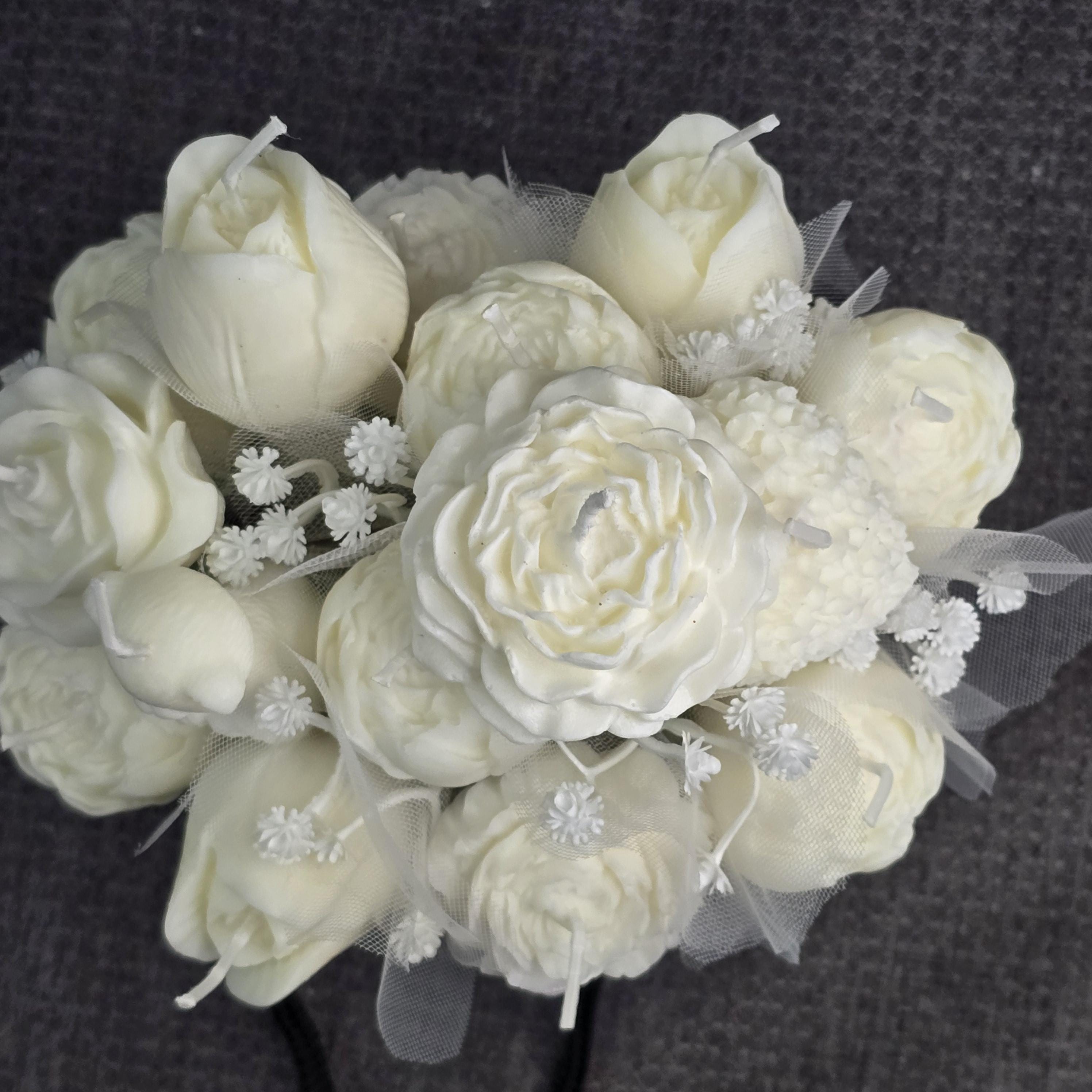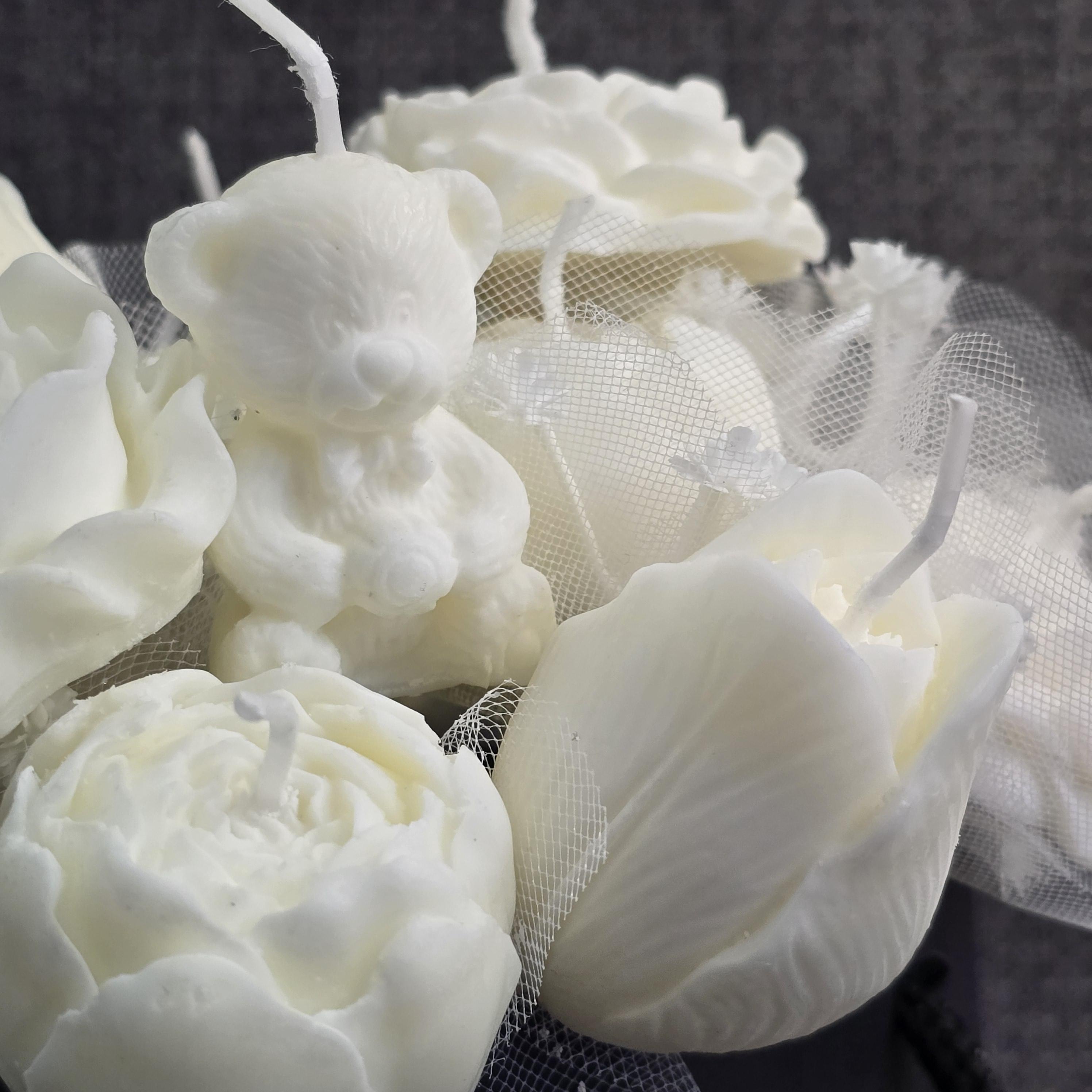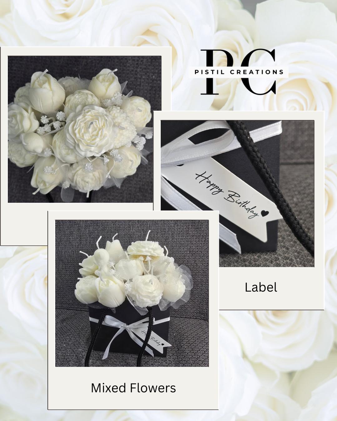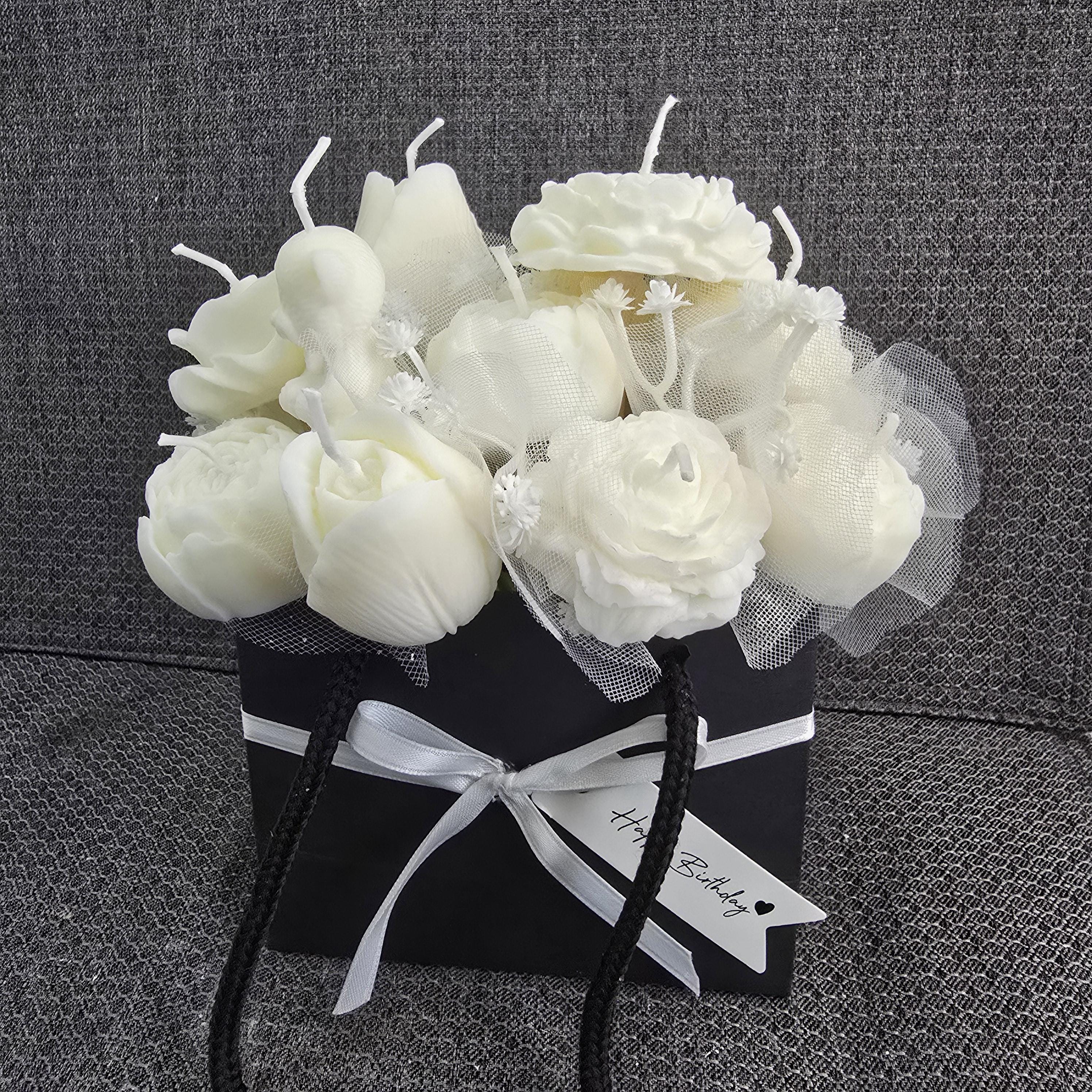 Flower Candle Bouquets are a perfect gift or simply just for your home. They allow you to enjoy your favorite fragrance as they burn, or they can be kept as a lasting memory since they stay beautiful much longer than real flowers. Container/vase may vary.